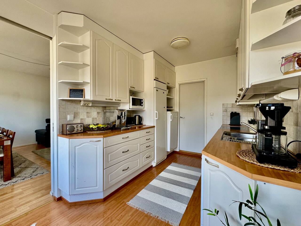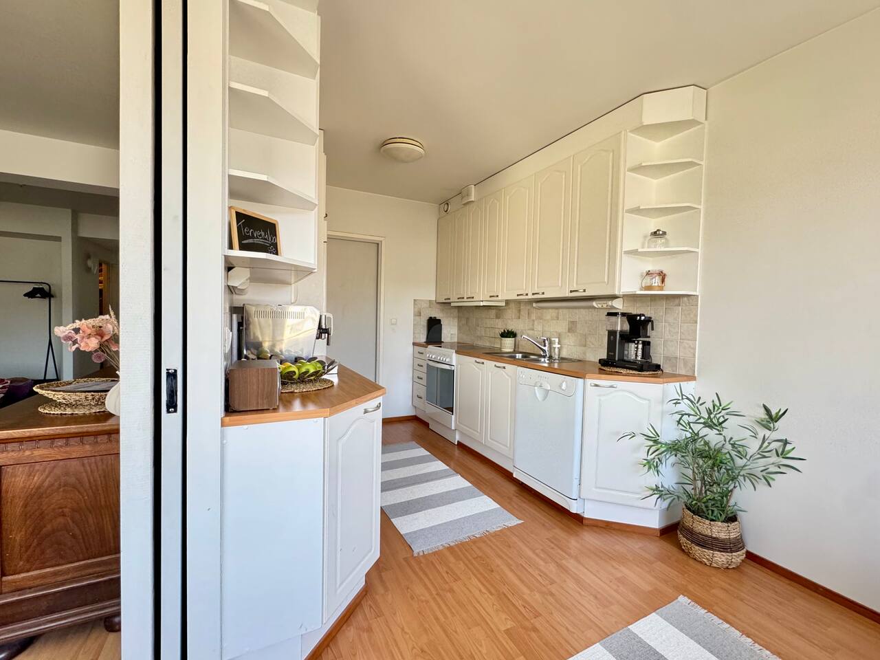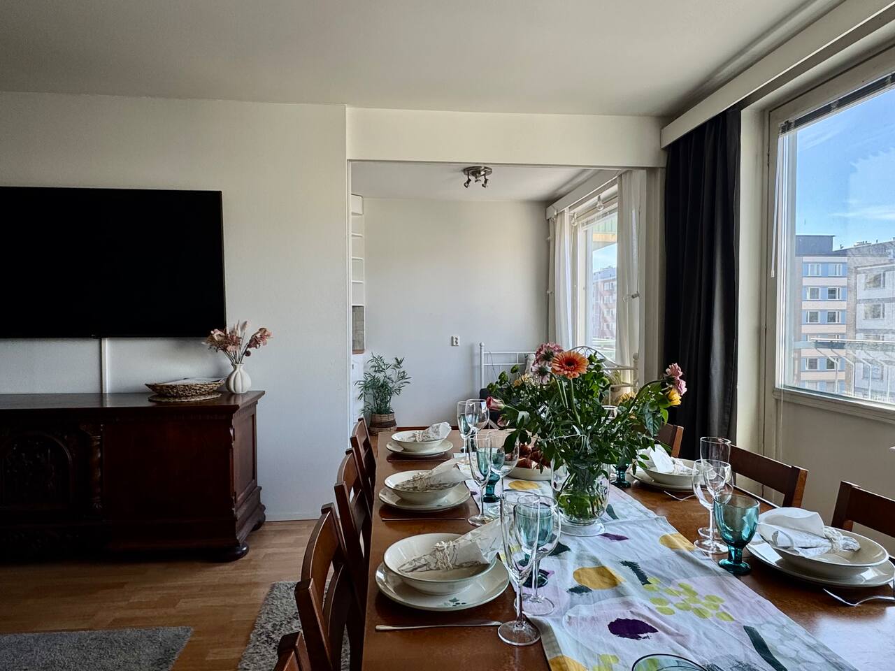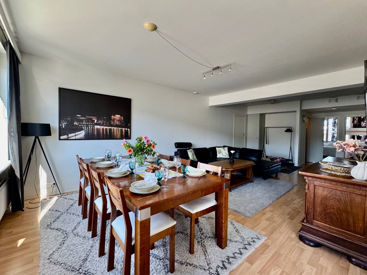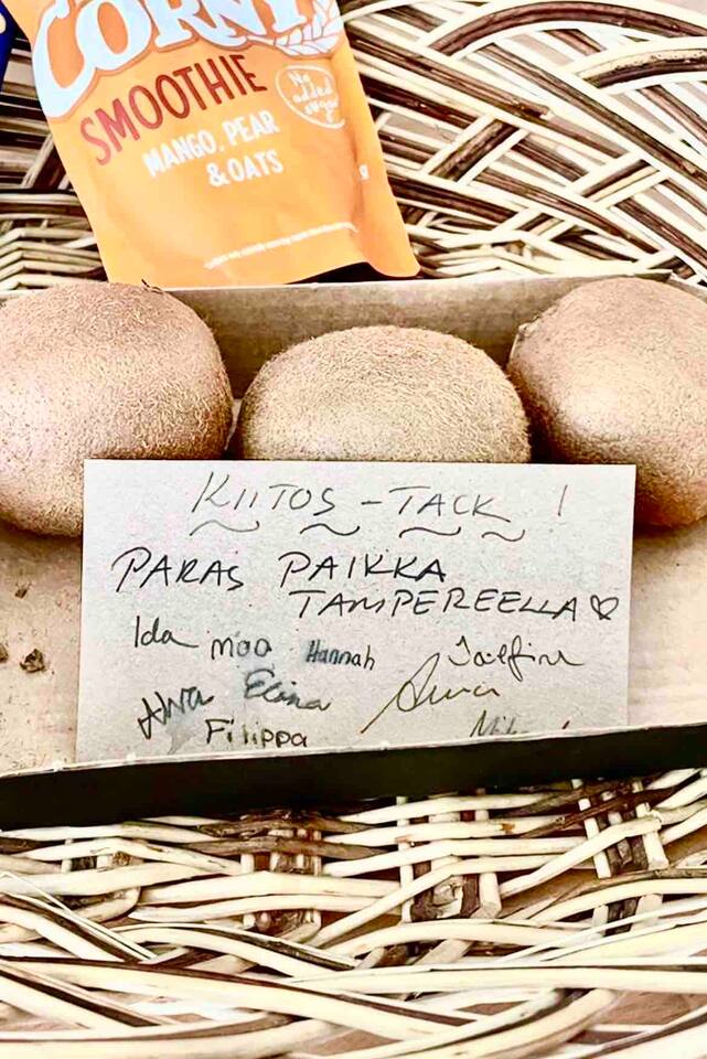 A spacious 93 m² city home in the very heart of Tampere – right next to the train station and Nokia Arena. A rare advantage in the city centre: free parking included. The apartment is ideal for larger groups, offering space for up to 12 guests and generous shared living areas. All services are just steps away, yet inside you’ll find your own peaceful retreat. This is a place where everyone can gather around the same table.