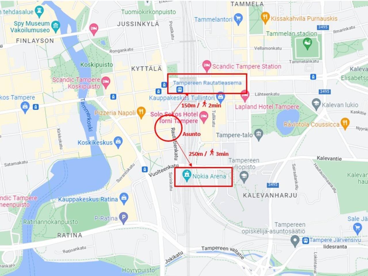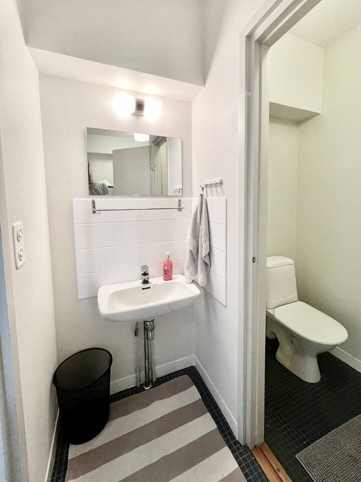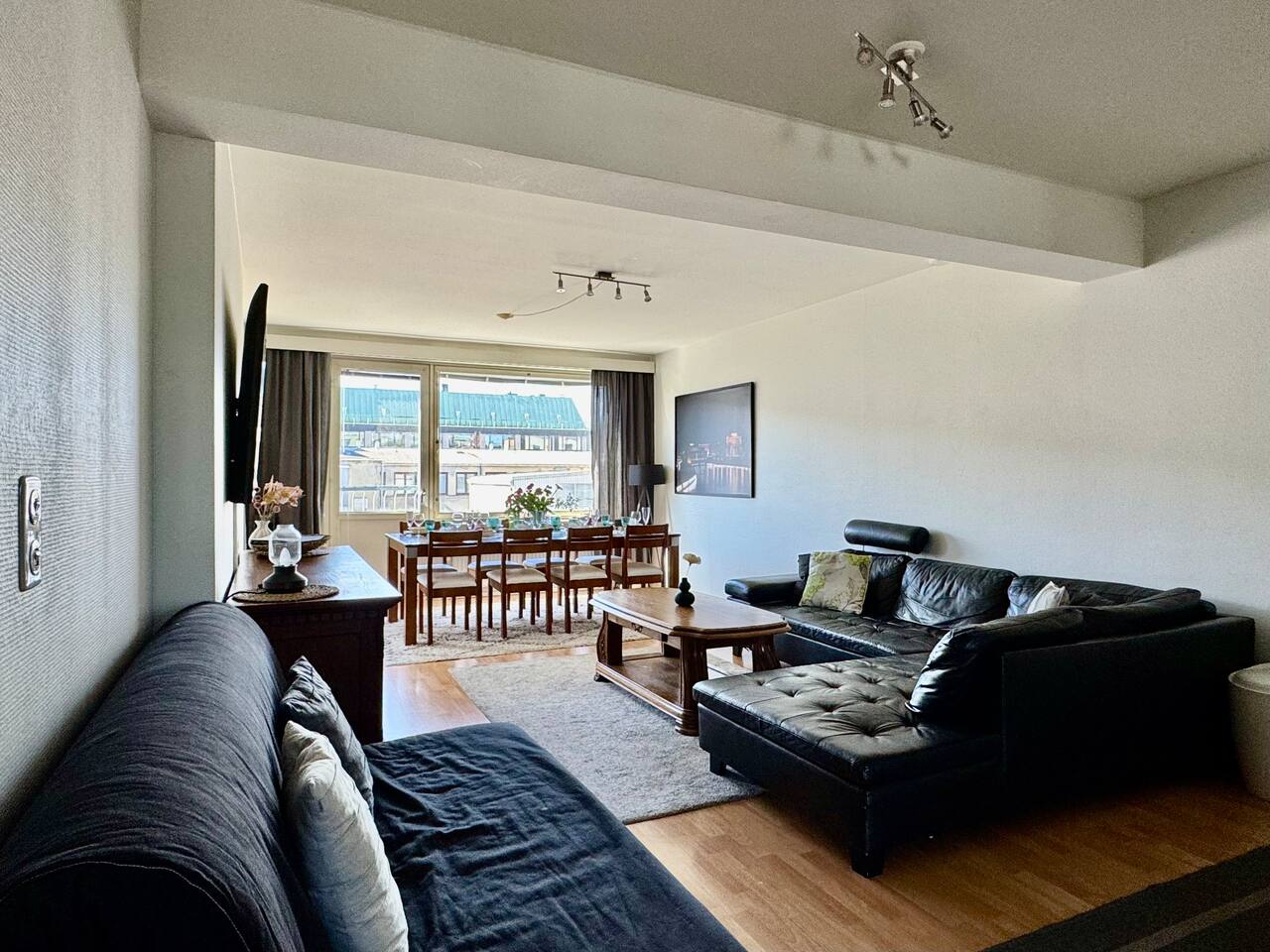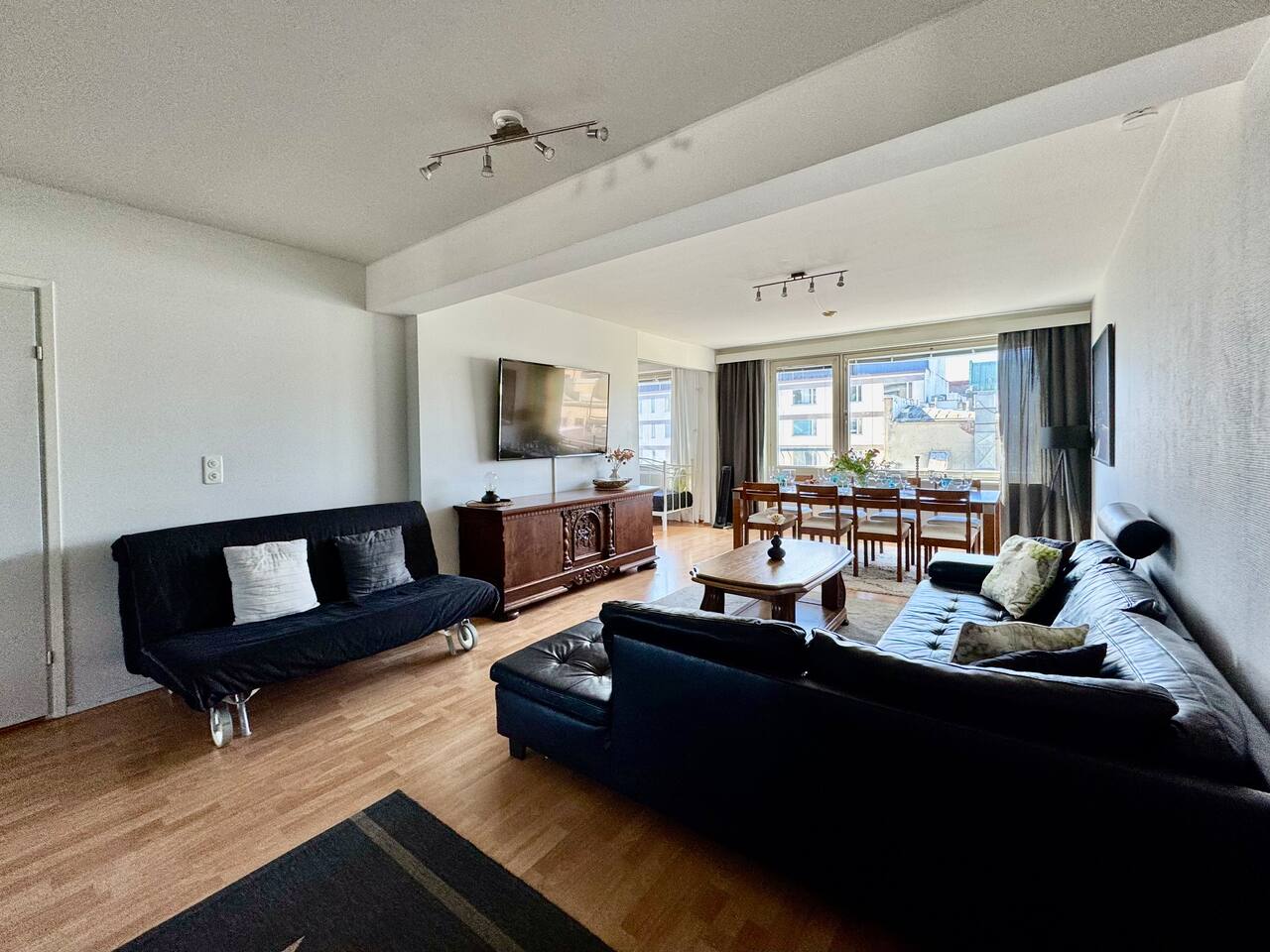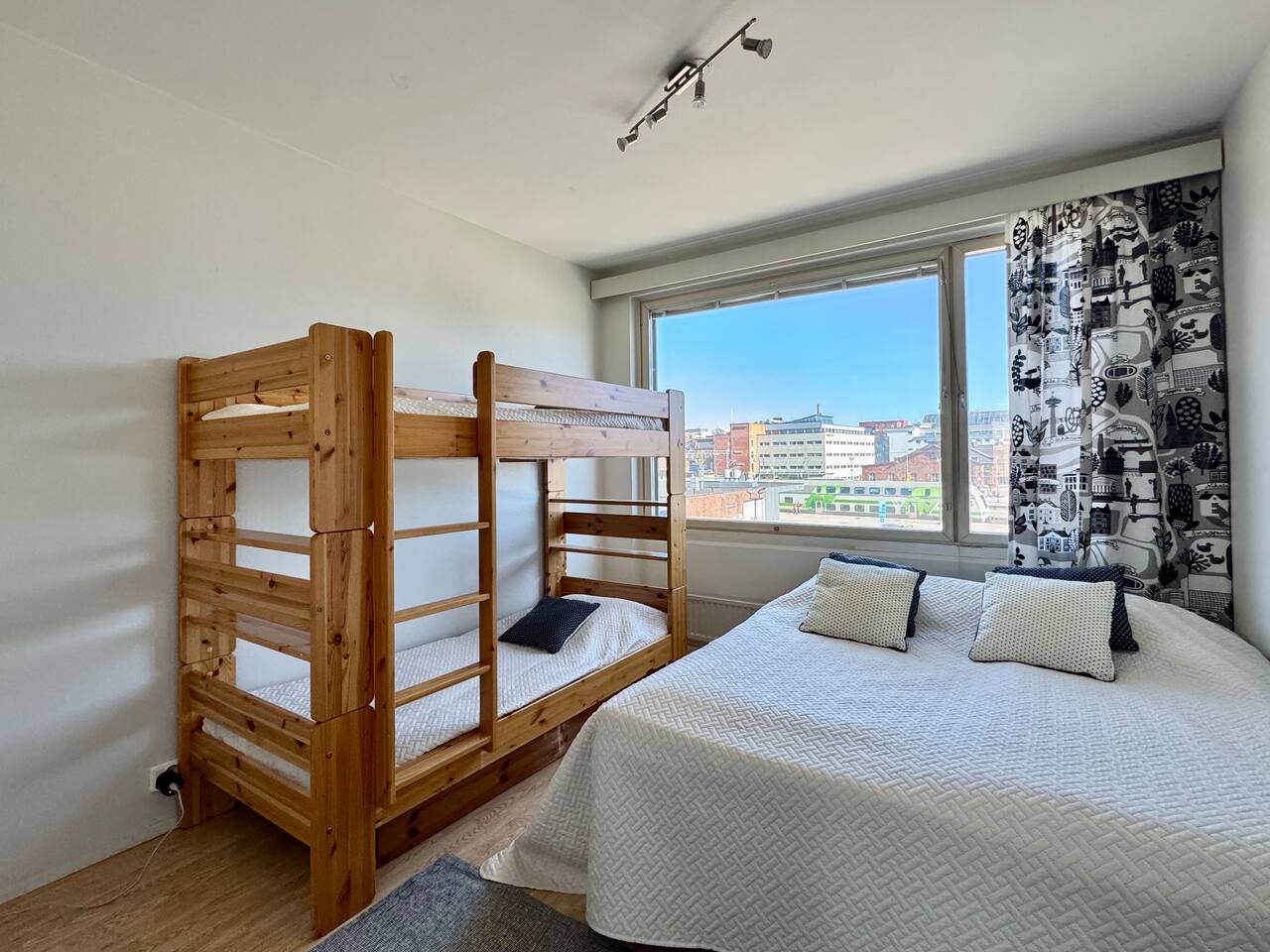 🔑 Highlights • Prime location: train station ~150 m, Nokia Arena ~250 m • Free parking – a rare benefit in the city centre • Accommodates up to 12 guests • Spacious living room and large dining table for the whole group • Flexible and versatile sleeping arrangements 📍 Location The apartment is located right in the heart of Tampere – in the middle of everything, yet peaceful inside. Within just a few minutes’ walk, you can reach: • Train station • Nokia Arena (events & games) • Ratina shopping centre • Restaurants, cafés, and nightlife Tram and bus stops are just around the corner, making it easy to get around without a car. And if you are arriving by car, the free parking makes your stay exceptionally convenient for such a central location. 🛋 Spaces & amenities The heart of the home is the spacious living room, where the whole group can comfortably spend time together. A large dining table allows for shared meals and evenings without feeling cramped. The kitchen is well equipped and suitable for larger groups. The apartment offers a great balance of space and practicality – making it easy to stay longer as well. 🛏 Sleeping arrangements The apartment offers flexible sleeping options for up to 12 guests: • Bedroom 1: double bed + bunk bed (4 guests) • Bedroom 2: double bed + bunk bed (4 guests) • Kitchen (separable with a sliding door): sofa bed (2 guests) • Living room: sofa bed (2 guests) Additionally: • Bedroom 2: pull-out extra bed for a child • Living room: large sofa that can be used for sleeping if needed • Extra mattresses available upon request 🎯 Perfect for • Groups of friends and event visitors • Families or multiple families traveling together • Work teams and project stays • Anyone who values a central location, convenience, and space